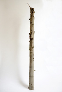 Lors d’une résidence en pleine nature dans la région picarde, Morgane Britscher a observé les inépuisables alignements d’arbres qui s’étendent, telles des lignes invisibles, le long des vallées jusqu’à dessiner un paysage au quadrillage parfaitement géométrique. Ces arbres sont des peupliers plantés artificiellement et ces vallées sont des champs insoupçonnés, il s’agit d’une populiculture. Par réaction, le geste qui surgit est celui qui vient briser le faux-semblant pour révéler une nature de plus en plus vidée de son âme. De l’arbre originel, l’artiste n’a gardé que l’écorce, contours matériels évoquant une présence fantomatique, telle une sculpture commémorative honorant un passé révolu. En utilisant l’absence et la vacuité comme matières à part entière, l’artiste fait émerger, par le creux, la véritable image de cette nature aliénée.